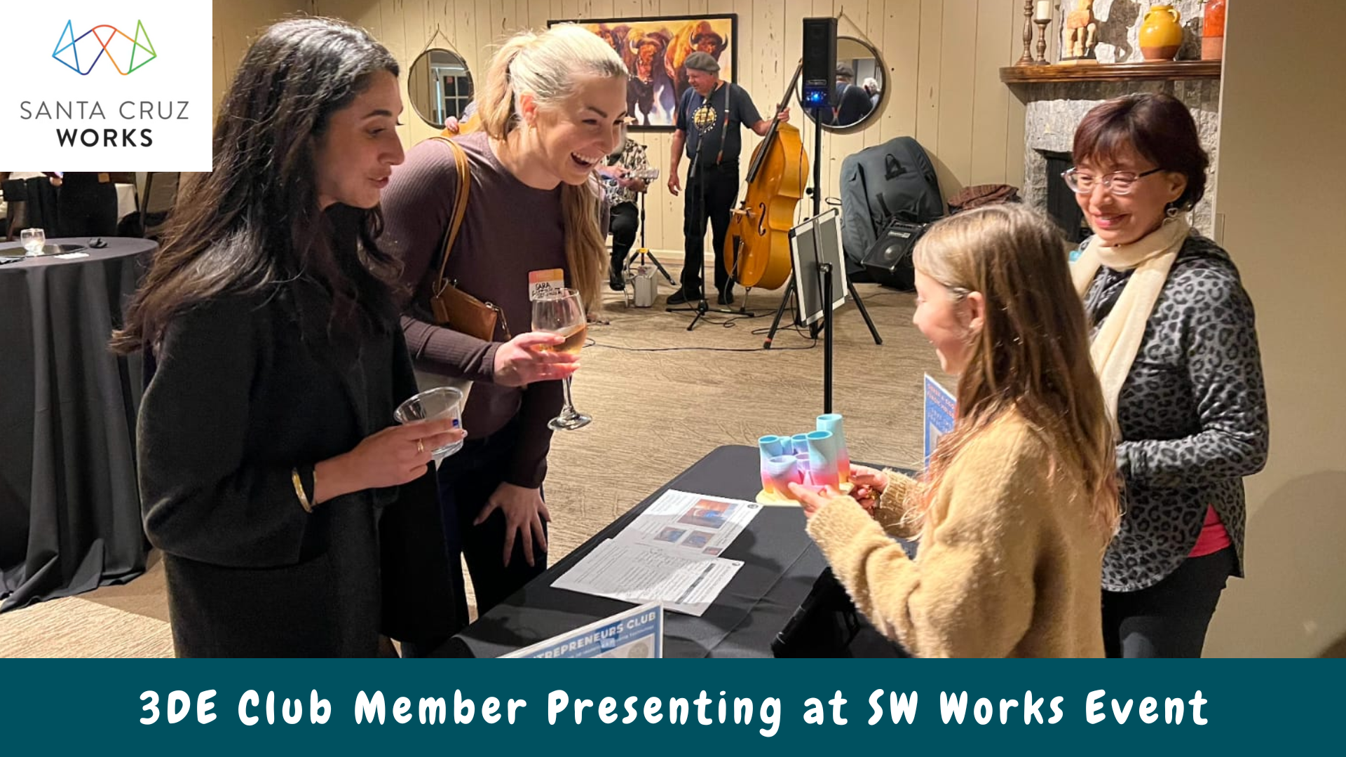 Santa Cruz, CA – Mar 5, 2025: 3DE Club member — Fiona — was invited to showcase her 3D‑printed creation at a real event space, complete with table display and direct access to the local tech and innovation community.